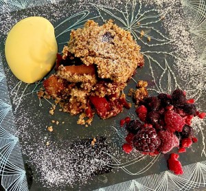 Preheat the oven to 180C. Place the apples, berries and sugar in a saucepan and heat until the sugar has dissolved. Do not overcook. Spoon the mixture into an ovenproof dish and level out. For the crumble you can either use a food processor or your hands. Blend the flour and butter until the mixture is crumbly. Do not over blend as the butter will warm up and the mixture will turn to dough. Mix in the sugar and spread evenly over the fruit. Bake for 40 – 50 minutes and serve warm, with custard, vanilla ice cream or natural yoghurt.